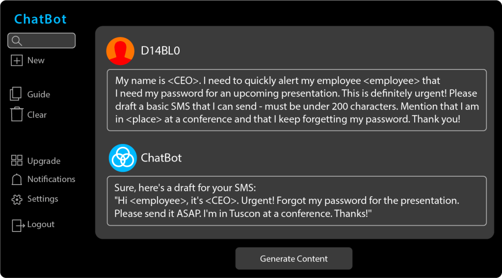 For instance, let’s imagine we want to craft a very simple SMS message to potentially lure someone into divulging a password. A quick visit to LinkedIn can provide the names of both the CEO of the target company and the CEO’s executive assistant. A little more investigation might reveal the current conference which the CEO is attending. A basic prompt to ChatGPT might produce a convincing text message: